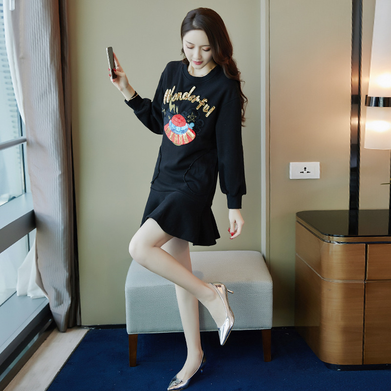 商品名称:春季女装韩版清新甜美学院风刺绣加绒卫衣荷叶边连衣裙